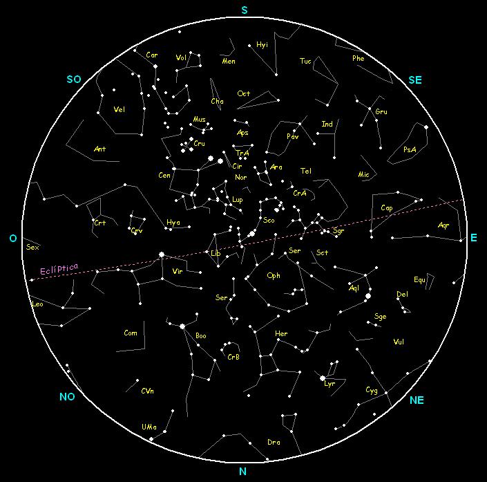 No alto do céu encontramos Scorpius, o Escorpião (Sco), associada às noites do inverno. Junto à cauda de Scorpius situa-se Sagittarius, o Sagitário (Sgr). Na direção dessa constelação é que está o centro de nossa galáxia. Entre Scorpius e Centaurus localiza-se a constelação de Lupus, o Lobo (Lup). Norma, o Esquadro (Nor), e Ara, o Altar (Ara) estão entre Scorpius e Triangulum Australe.